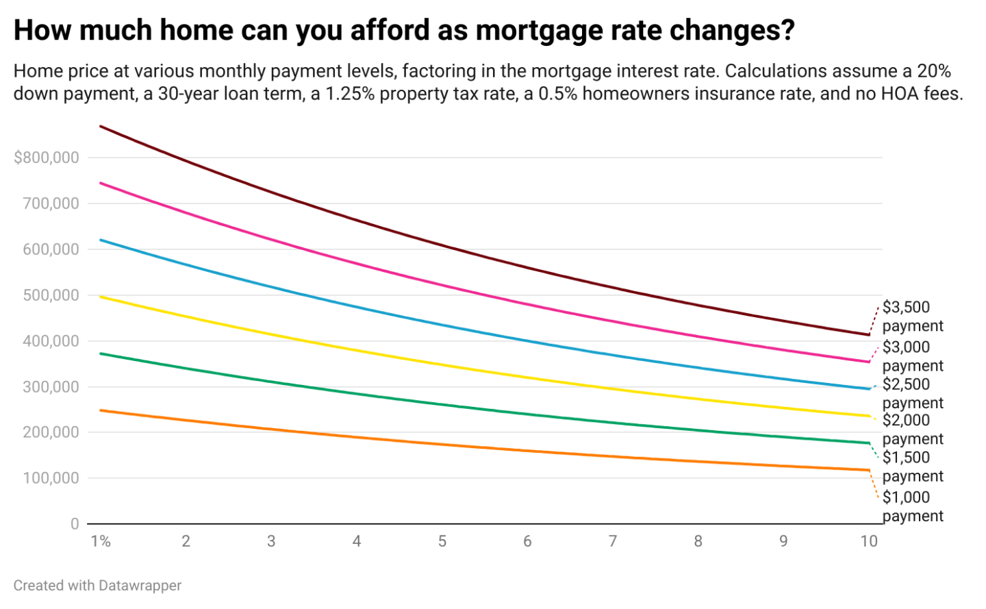 In June, when rates averaged 6.9% a buyer could afford about $446,000, assuming a 20% down payment on a 30-year mortgage.